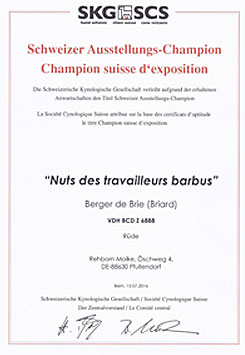 Heute kam die offizielle Bestätigung der SKG mit der Post. Mit seinen Erfolgen bei den Ausstellungen in Kreuzlingen und Aarau hat Nuts alle Bedingungen erfüllt, um diesen Titel zu tragen. So ist er nun, nach nur 2 Starts in der Offenen Klasse berechtigt, in der Champion Klasse zu starten. Gut gemacht junger Mann!